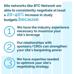 their side of the table and group together in a network. Site networks like BTC Network are able to consistently negotiate at least a 20-40% increase in study budgets because: